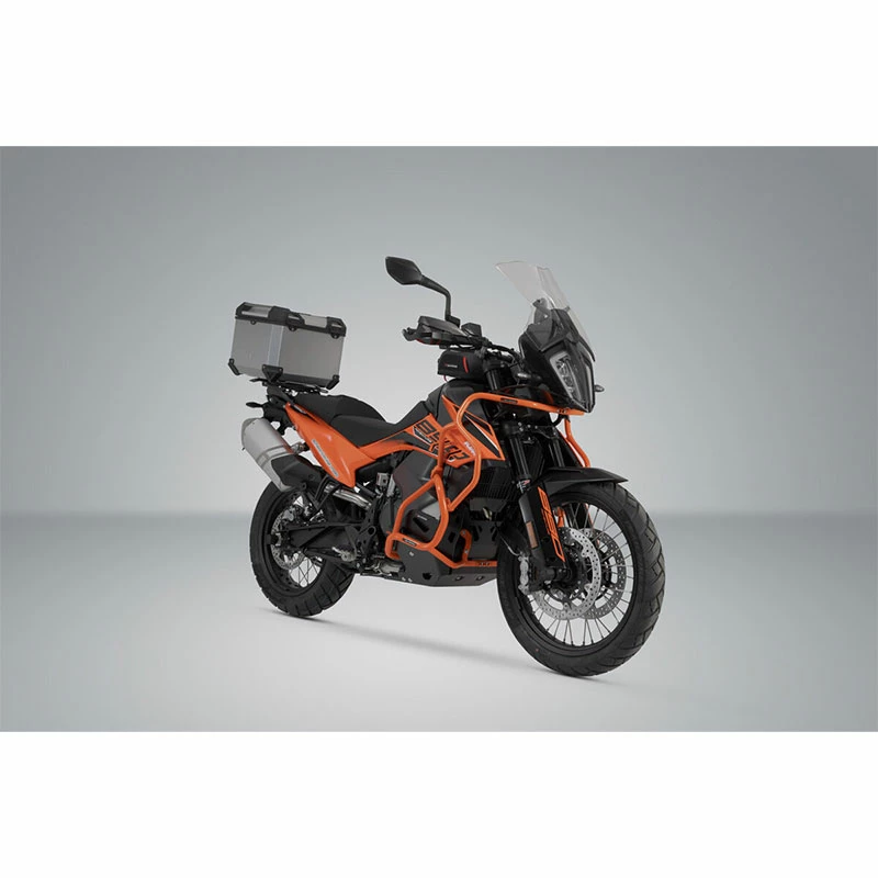 The TRAX ADV top case system consists of a sturdy silver top case and a matching ADVENTURE-RACK for the KTM 790 Adventure and KTM 890 Adventure.