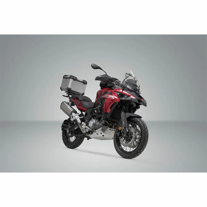 The TRAX ADV top case system consists of a rugged black top case and the matching ADVENTURE-RACK for the Benelli TRK 502 X.