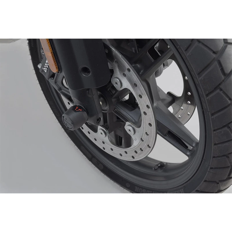 The front axle crash pads made of abrasion-resistant plastic protect the drive shaft from damage in the event of a fall. The smooth surface also provides excellent sliding properties. The polished bull logo in red adds a visual highlight to your motorcycle.
