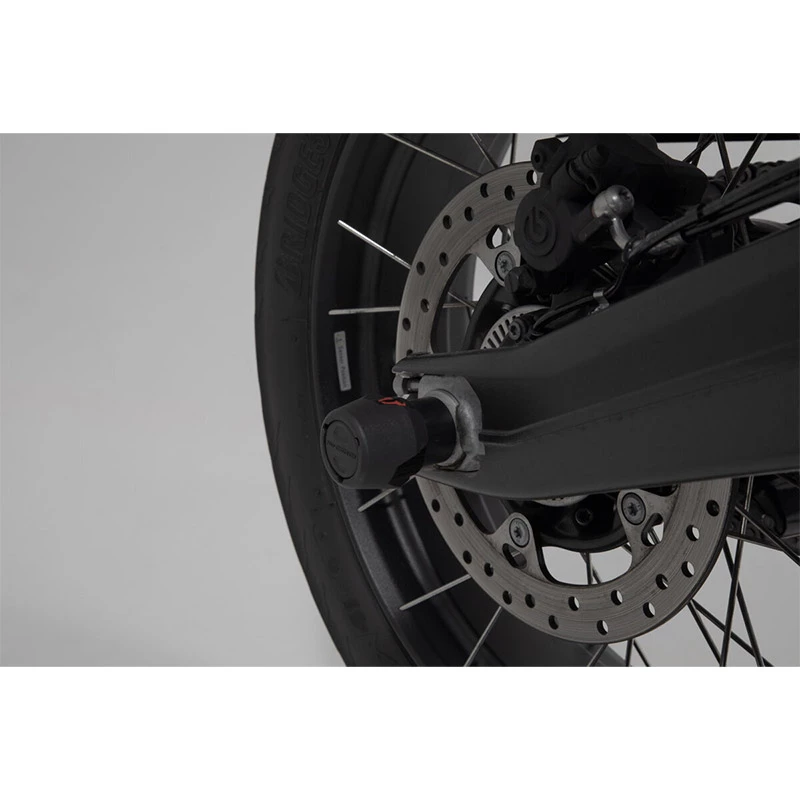 The rear axle crash pads made of abrasion-resistant plastic protect the swing arm from damage in the event of a fall. With a fiberglass content of 30%, the crash pad core is impact-resistant. The smooth surface also provides excellent sliding properties. The polished bull logo in red adds a visual highlight to your motorcycle.