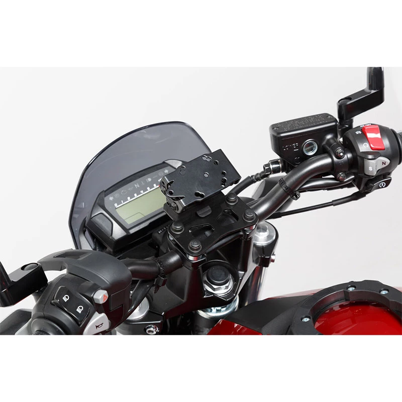 Retaining plate with universal drill-hole pattern provides secure hold for the usual GPS models and Navi Case Pro device cases or hardcases from SW-MOTECH.