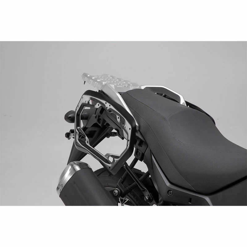 Durable TRAX ADV aluminum cases feel at home on any stretch of road: embossed patterns add stability to the 1.5 millimeter-thick, welded aluminum wall material. A completely removable lid with carrying handles made of anodized aluminum and quick release fasteners makes loading and unloading of motorcycle luggage easier; the beveled side edge provides high ground clearance when cornering. With this complete solution, you have all the components you need to travel with TRAX: two waterproof TRAX ADV side cases, two detachable SW-MOTECH side carriers, adapter kit, lock set, lid limiter and anti-theft protection at an attractive price.