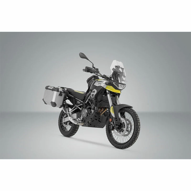 Durable TRAX ADV aluminum cases feel at home on any stretch of road: embossed patterns add stability to the 1.5 millimeter-thick, welded aluminum wall material. A completely removable lid with carrying handles made of anodized aluminum and quick release fasteners makes loading and unloading of motorcycle luggage easier; the beveled side edge provides high ground clearance when cornering. With this complete solution, you have all the components you need to travel with TRAX: two waterproof TRAX ADV side cases, two detachable SW-MOTECH side carriers, adapter kit, lock set, lid limiter and anti-theft protection at an attractive price.