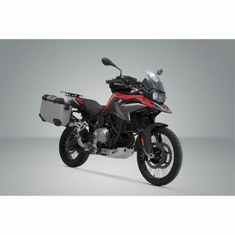 Durable TRAX ADV aluminum cases feel at home on any stretch of road: embossed patterns add stability to the 1.5 millimeter-thick, welded aluminum wall material. A completely removable lid with carrying handles made of anodized aluminum and quick release fasteners makes loading and unloading of motorcycle luggage easier; the beveled side edge provides high ground clearance when cornering. With this complete solution, you have all the components you need to travel with TRAX: two waterproof TRAX ADV side cases, two detachable SW-MOTECH side carriers, adapter kit, lock set, lid limiter and anti-theft protection at an attractive price.