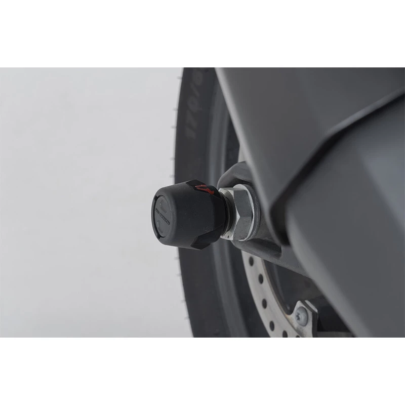The rear axle crash pads made of abrasion-resistant plastic protect the swing arm from damage in the event of a fall. With a fiberglass content of 30%, the crash pad core is impact-resistant. The smooth surface also provides excellent sliding properties. The polished bull logo in red adds a visual highlight to your motorcycle.