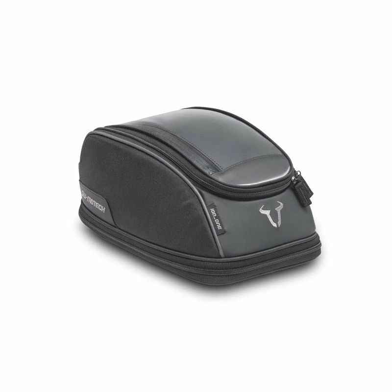 The compact ION one tank bag is suitable for almost all tank shapes and is perfect for short tours. Should 5 l of storage not be enough, the volume can be doubled with a circumferential zipper. ION series tank bags available in three sizes and shapes The new generation of ION tank bags captivates with its sleek design. Soft vinyl details, embroidered SW-MOTECH bull and reflective textile piping give these black tank bags an unmistakable look. Of course, the new ION tank bags have proven features such as volume expansion, integrated map holder, internal mesh compartments, and splash-proof cable feed-through and integrated carrying handle