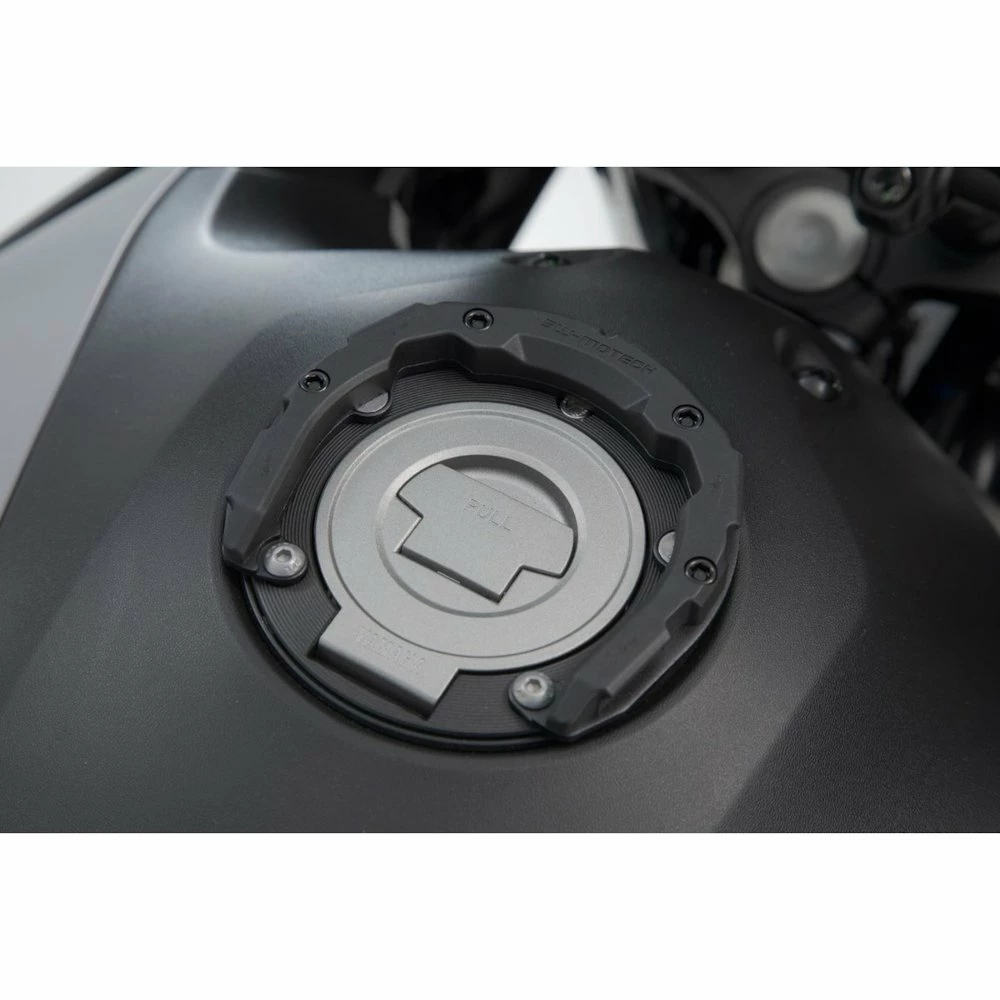 – your luggage is safe with this clever solution. The mechanical locking mechanism secures the tank bag, and the magnets bring both parts of the ring together. The robust fibreglass reinforced plastic with its high-precision locking geometry is responsible for ensuring that the tank bag remains firmly in place in all situations. The patented PRO tank ring is made to suit the tank filler neck of the motorcycle model. This ensures the best possible positioning onto the tank.