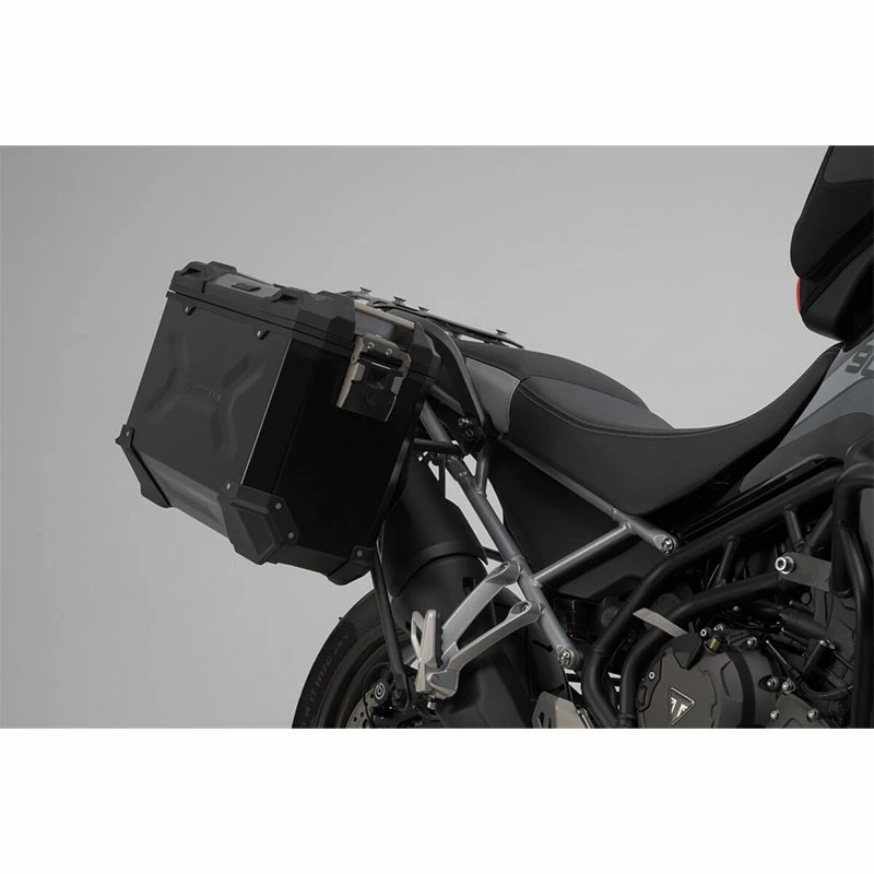 Durable TRAX ADV aluminum cases feel at home on any stretch of road: embossed patterns add stability to the 1.5 millimeter-thick, welded aluminum wall material. A completely removable lid with carrying handles made of anodized aluminum and quick release fasteners makes loading and unloading of motorcycle luggage easier; the beveled side edge provides high ground clearance when cornering. With this complete solution, you have all the components you need to travel with TRAX: two waterproof TRAX ADV side cases, two detachable SW-MOTECH side carriers, adapter kit, lock set, lid limiter and anti-theft protection at an attractive price.