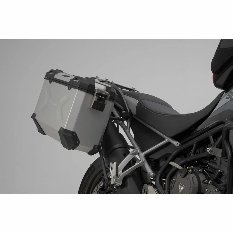 Durable TRAX ADV aluminum cases feel at home on any stretch of road: embossed patterns add stability to the 1.5 millimeter-thick, welded aluminum wall material. A completely removable lid with carrying handles made of anodized aluminum and quick release fasteners makes loading and unloading of motorcycle luggage easier; the beveled side edge provides high ground clearance when cornering. With this complete solution, you have all the components you need to travel with TRAX: two waterproof TRAX ADV side cases, two detachable SW-MOTECH side carriers, adapter kit, lock set, lid limiter and anti-theft protection at an attractive price.