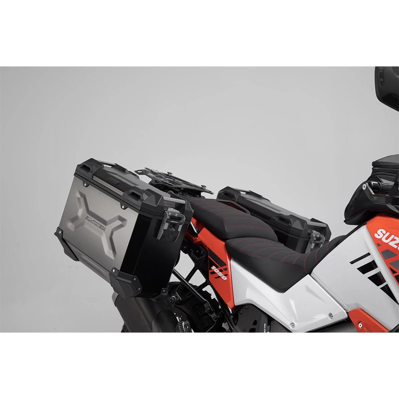 Durable TRAX ADV aluminum cases feel at home on any stretch of road: embossed patterns add stability to the 1.5 millimeter-thick, welded aluminum wall material. A completely removable lid with carrying handles made of anodized aluminum and quick release fasteners makes loading and unloading of motorcycle luggage easier; the beveled side edge provides high ground clearance when cornering. With this complete solution, you have all the components you need to travel with TRAX: two waterproof TRAX ADV side cases, two detachable SW-MOTECH side carriers, adapter kit, lock set, lid limiter and anti-theft protection at an attractive price.