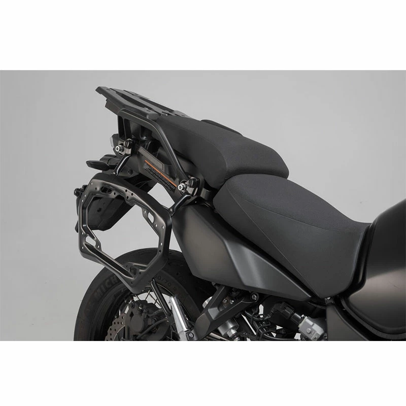 Order, unpack, mount and drive away. The TRAX ION aluminum case system contains everything needed to mount two side cases on your motorcycle: two TRAX ION side cases, two removable SW-MOTECH side carriers, anti-theft protection, matching locks, adapter kit and accessories. The bike-specific carriers and the size of the cases are perfectly matched to the rear shape and exhaust system of the motorcycle.