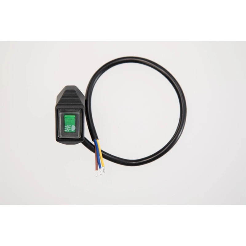 The green-lit, splash-proof on/off switch is connected to three plug connectors via an insulated cable. This compact switch can be attached to barrel handlebars with Ø 22 mm up to 1 inch (25.4 mm).Also available in a blue version for high beams The switches are already included in delivery with EVO lights.