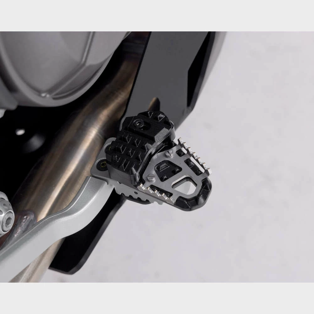 SW-MOTECH manufactures these extensions from high-strength milled aluminum alloy; they feature a black anodized surface and a stainless steel step plate. For optimal ergonomic adjustment, the increase in the brake pedal step can be adjusted in two stages of 22 or 27 millimeters.